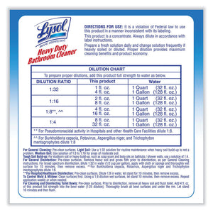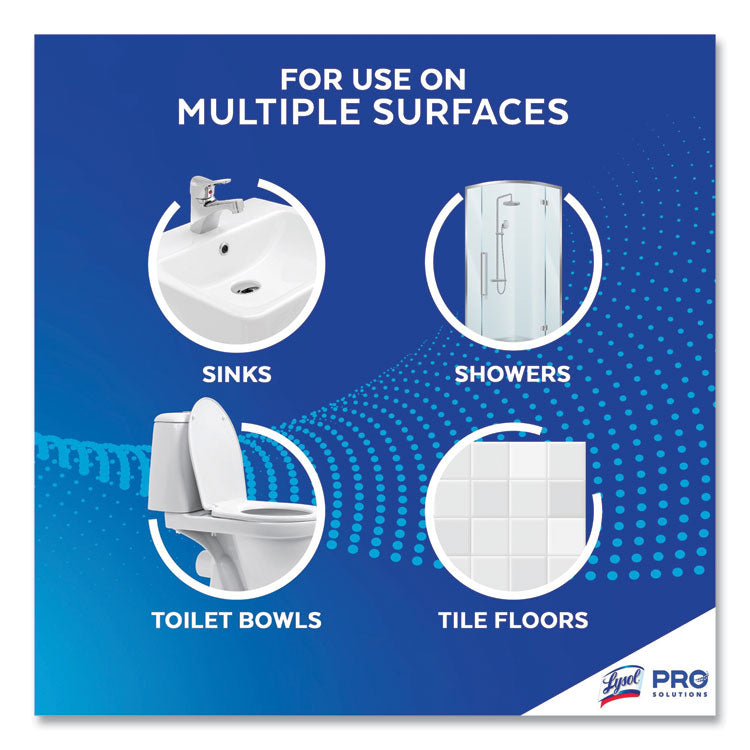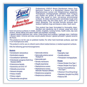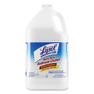 Optimize cleaning time with a bathroom cleaner that disinfects, deodorizes, and cuts through tough soils. Arm your cleaning staff with the cleaning action of Lysol Professional Disinfectant Heavy Duty Bathroom Cleaner. Kill 99.9% of viruses and bacteria (including Rotavirus WA) when used as directed on hard, non-porous surfaces. Maintain cleaning protocols in high-volume facilities with a concentrated formula that's easy to dilute. Reduce how often you have to restock janitorial supplies with the concentrated formula. This product has been formulated to thoroughly clean, disinfect and deodorize tub and shower areas and other hard non-porous surfaces such as glazed ceramic bathroom tile, sinks, toilet bowls and surfaces, garbage cans, bathtubs, shower stalls, chrome and clear acrylic plastic fixtures, glazed porcelain and glazed ceramic tile floors.