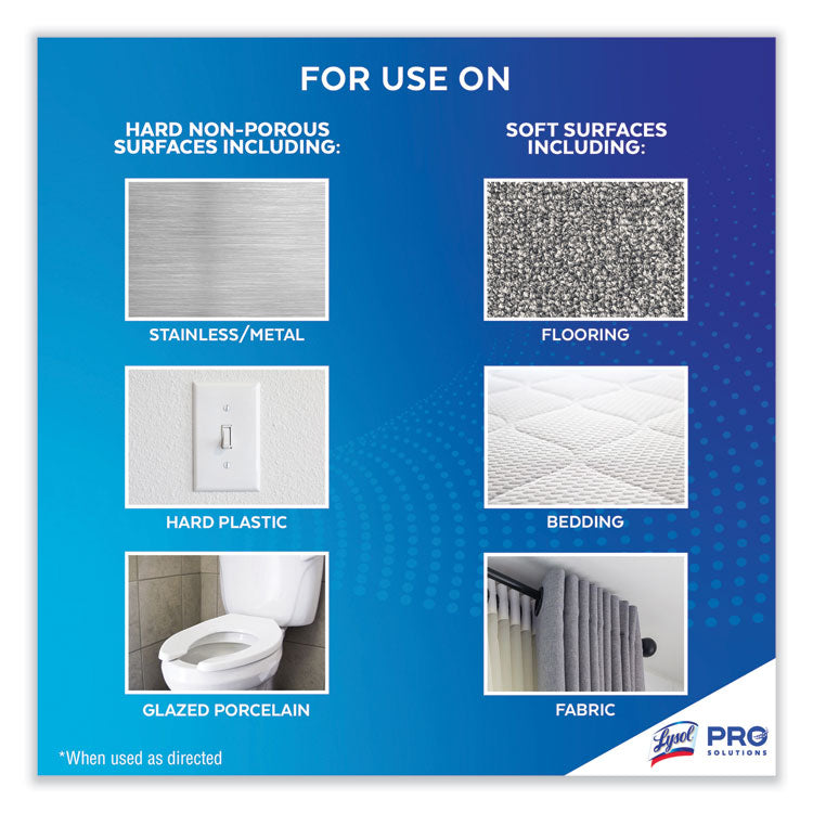 Boost customer confidence with Lysol Professional Disinfectant Spray that's safe to use on hard and soft surfaces. Lysol kills 99.9% of viruses and bacteria, including the virus that causes COVID-19 in 15 seconds, as well as cold and flu viruses when used as directed. Help protect high-traffic areas and high-touch surfaces, including desks, bathrooms, doorknobs, and railings. Deliver hospital-type disinfection into soft surfaces, including upholstery, curtains, sofas, mattresses, and cushions. Meet customer and staff expectations around disinfection. Simply spray and let air dry.