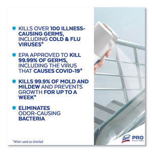 Boost customer confidence with Lysol Professional Disinfectant Spray that's safe to use on hard and soft surfaces. Lysol kills 99.9% of viruses and bacteria, including the virus that causes COVID-19 in 15 seconds, as well as cold and flu viruses when used as directed. Help protect high-traffic areas and high-touch surfaces, including desks, bathrooms, doorknobs, and railings. Deliver hospital-type disinfection into soft surfaces, including upholstery, curtains, sofas, mattresses, and cushions. Meet customer and staff expectations around disinfection. Simply spray and let air dry.