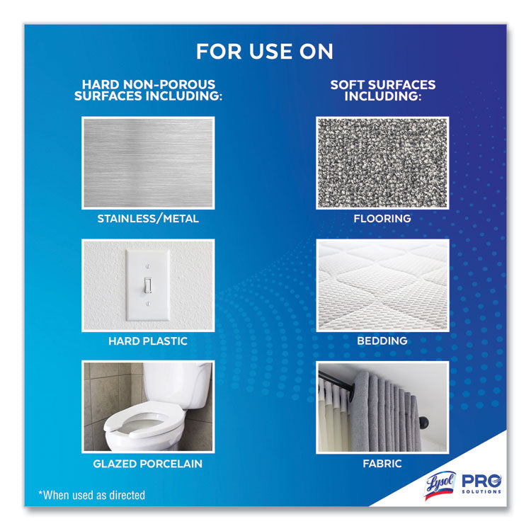 Get maximum versatility with minimal effort with Lysol Disinfectant Spray that's safe to use on hard and soft surfaces. Lysol kills 99.9% of viruses and bacteria, including the virus that causes COVID-19 in 15 seconds, as well as cold and flu viruses when used as directed. Help protect high-traffic areas and high-touch surfaces, including desks, bathrooms, doorknobs, and railings. Deliver hospital-type disinfection on to soft surfaces, including upholstery, curtains, sofas, mattresses, and cushions. Meet customer and staff expectations around disinfection. Simply spray and let air dry.
