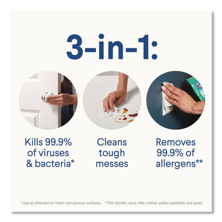 Clorox Disinfecting Wipes clean, disinfect and remove allergens leaving behind a pleasant scent. Disinfecting Wipes clean and disinfect with antibacterial power that kills 99.9% of viruses and bacteria that can live on surfaces, including COVID-19 Virus, staph, E. coli, MRSA, salmonella, strep and Kleb on hard, nonporous surfaces when used as directed. These all-purpose disposable wipes remove common allergens, germs and messes on surfaces like kitchen counters, bathroom surfaces and more. Disinfecting Wipes are safe to use on a variety of surfaces including non-food-contact surfaces in the home, office, daycares, schools, hotels, restaurants, and more. Use as directed. Allow product to air dry.