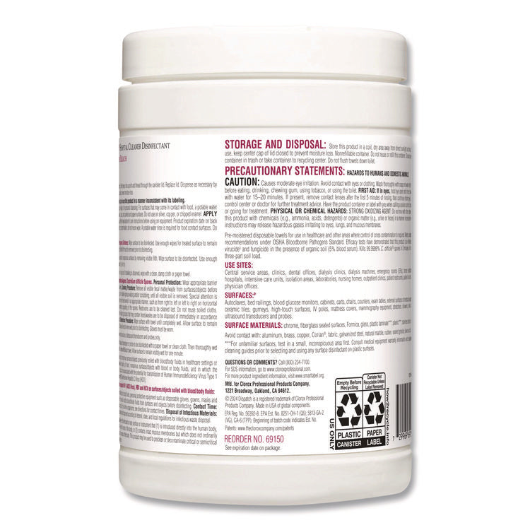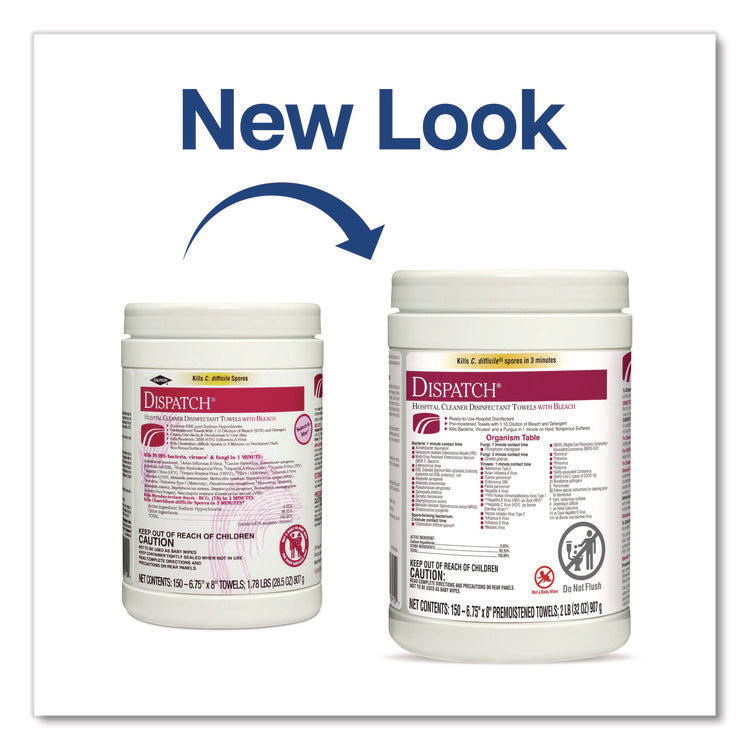 Dispatch Hospital Cleaner Disinfectant Towels w/Bleach, 1-Ply, 6.75 x 8, Unscented, White, 150/Canister, 8 Canisters/Carton