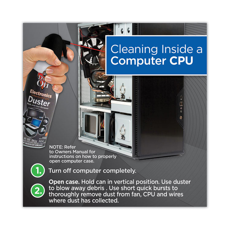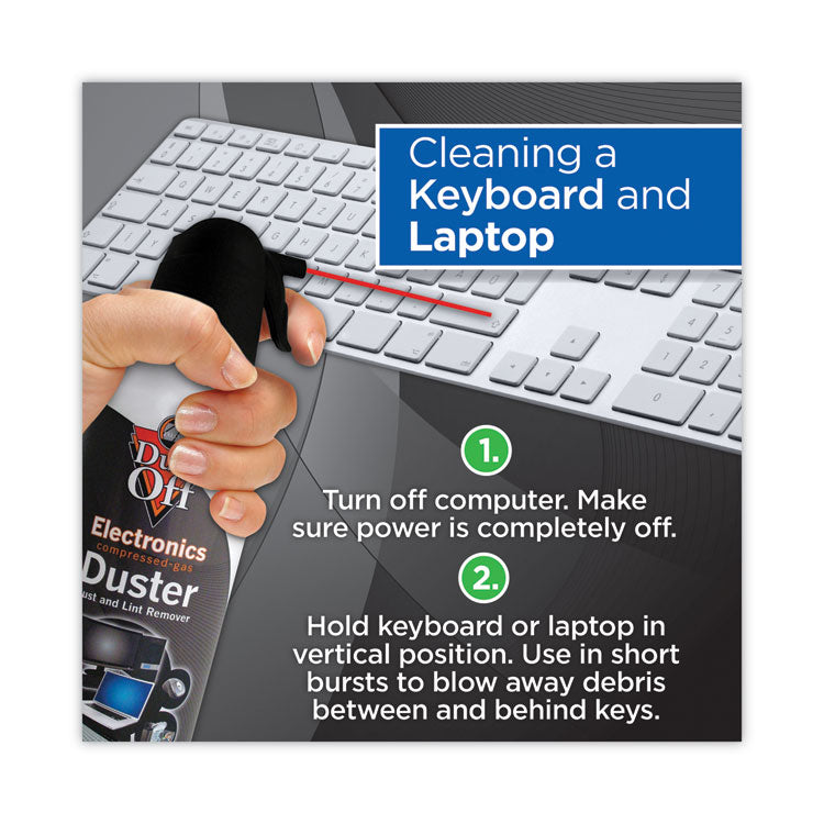 Dust-Off disposable dusters provide potent dust-removing power for practically any task. Ideal for cleaning technology like keyboards, laptops and CPUs. But it's not just for electronics! Dust-Off dusters are also great for cleaning items in the home such as collectibles, window blinds, lamp shades, craft projects and sewing machines. Each duster includes extension tube to get in hard-to-reach places. Contains a bitterant to help discourage inhalant abuse.
