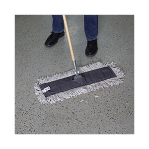 Four-ply, pretreated yarn, dust mop head. Equipped with a slot pocket backing which allows a metal dust mop frame to slide into its place quickly and easily. Sewn center fringe for added coverage and durability. The disposable head can be discarded when dirty. Ideal for use on floors that require dusting, with or without cleaning spray. Handle and frame are sold separately.