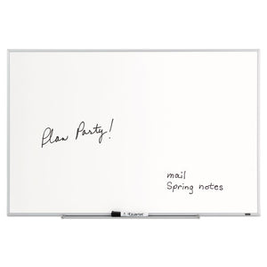 From a dorm room to a conference room, this dry-erase board provides an efficient way to eliminate paper clutter and keep track of messages and ideas. The white board surface and silver aluminum frame give the board a sleek look and feel. Create to-do lists and reminders with this versatile board. The melamine dry-erase surface makes writing easy and clean-up quick. Great for occasional use in any small or home office. Comes with versatile marker tray and dry-eraser marker.