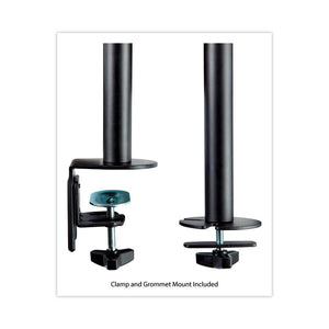 Free up valuable desk space and bring your monitor to a comfortable viewing height and distance while sitting or standing. Sturdy steel construction holds two monitors up to 28.5" width and 20 lb each. Easily clamp mounts to surfaces up to 3.25" thick, no tools needed (grommet mount also available). Cord management clips on the arms and pole. Fully adjustable as you can set height on 15" pole rotation (portrait to landscape), 360° tilt (forward/back) from +45° to -45°, pan (left/right) from +90° to -90° and arm swivel with clamp mount (front to back) to 90°.