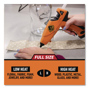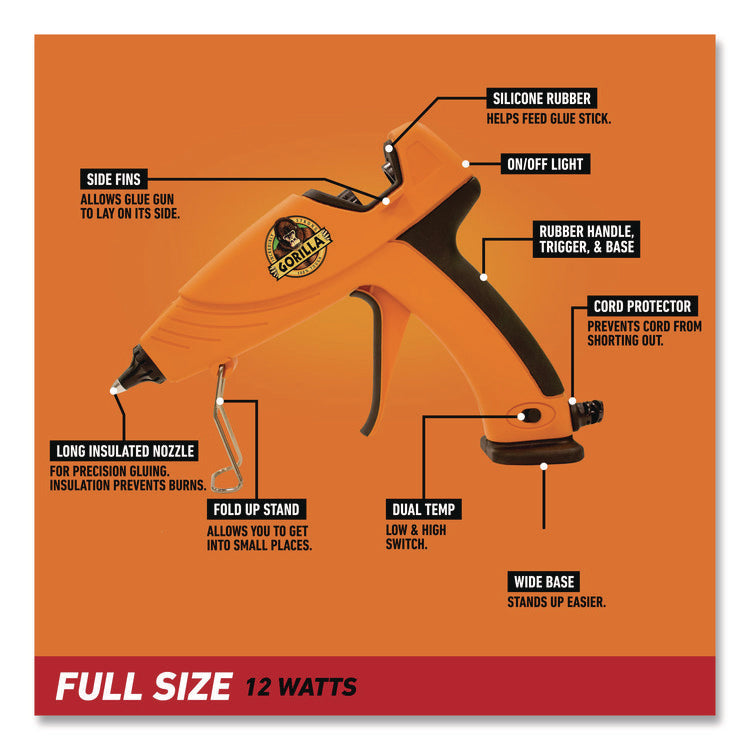 The Gorilla Dual Temp full-size glue gun is a great tool for crafts and home projects requiring more glue output and volume. The gun is lightweight, with a comfortable grip and a built-in stand making it easy to use. The easy-squeeze trigger and long insulated nozzle allow for precise application on any project.