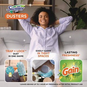 Swiffer Dusters TRAP + LOCK dust wherever dust shows up, including fan blades, blinds, car interior, keyboard vents, bookcases, and more. They are made with specially coated fibers that grab onto dust and don't let go. Enjoy the lasting freshness of Gain as you clean. Leaves behind up to one hour of freshness after initial product use.