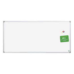 The MasterVision™ Earth Magnetic Steel Dry Erase Board is a solution that combines the best in writing and cleaning performance with professional Maya frame quality. Made from recycled and recyclable materials, this board is suitable for frequent use. The magnetic surface cleans easily and features a sturdy aluminum frame that has an easy 4-corner mounting system that can be positioned either vertically or horizontally, offering versatility when reconfiguring an office or where wall space is limited. The adjustable pen tray offers a convenient way to keep your writing utensils within quick reach.