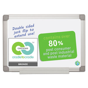 MasterVision® Earth Silver Easy Clean Dry Erase Boards are a solution that combine superior writing and cleaning performance with professional Maya frame quality. Made from recycled and recyclable materials, these non-magnetic boards are double-sided to provide twice the life of standard melamine whiteboards. Both board surfaces are suitable for moderate use and can easily be flipped when necessary. Four-corner system allows for both vertical and horizontal mounting, offering versatility when reconfiguring an office and where wall space might be limited. An adjustable accessory rail offers a convenient way to keep your markers within easy reach. Sturdy, heavy-gauge aluminum frame.