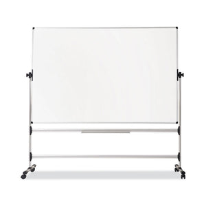 Durable and versatile dry erase boards are perfect for classrooms and all training environments. Silver Easy Clean surface resists ghosting. Dual surfaces revolve easily, providing you with additional writing space. Portable with easy glide locking casters for full mobility. Extra large steel repositionable pen tray can be easily relocated to different places. Steel tubular frame and support bars with extra stability bar prevent wobbling. Plastic removable easel pad clips included. The smart design and clean lines will complement any work space. Mobile and practical, they ensure the audience's attention while adapting to any room.