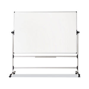 Durable and versatile dry erase boards are perfect for classrooms and all training environments. Silver Easy Clean surface resists ghosting. Dual surfaces revolve easily, providing you with additional writing space. Portable with easy glide locking casters for full mobility. Extra large steel repositionable pen tray can be easily relocated to different places. Steel tubular frame and support bars with extra stability bar prevent wobbling. Plastic removable easel pad clips included. The smart design and clean lines will complement any work space. Mobile and practical, they ensure the audience's attention while adapting to any room.