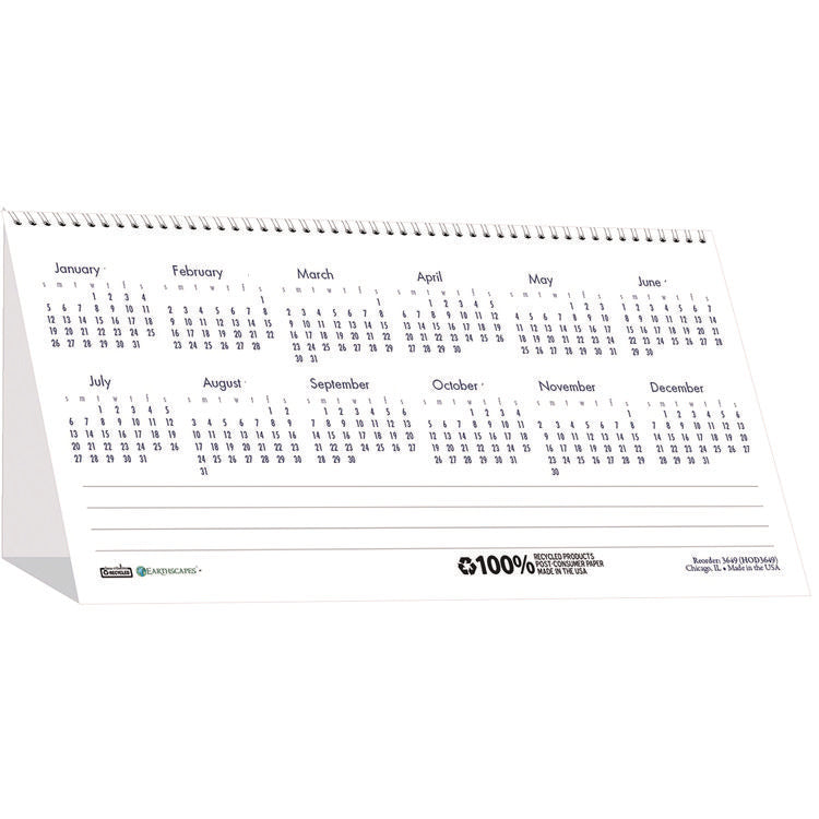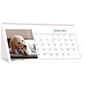 Brighten your office with adorable puppy images that change every month. Stand-alone, tent-design calendar is perfect where desk space is limited. Full-year reference calendar on the back of each page. Spiralbound at the top for easy reference of future and past months. Made entirely of recycled materials.