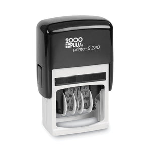 Combine date and phrase for efficient stamping. Common business phrases included. Use either year or phrase. Four-band date: months, days and five-year band. Innovative Band Shield Technology: Say goodbye to messy hands! Our Band Shield Technology prevents ink from coming into contact with your hands and fingers during the date-changing process. Self-inking dater with plastic frame. Type size 1.5.
