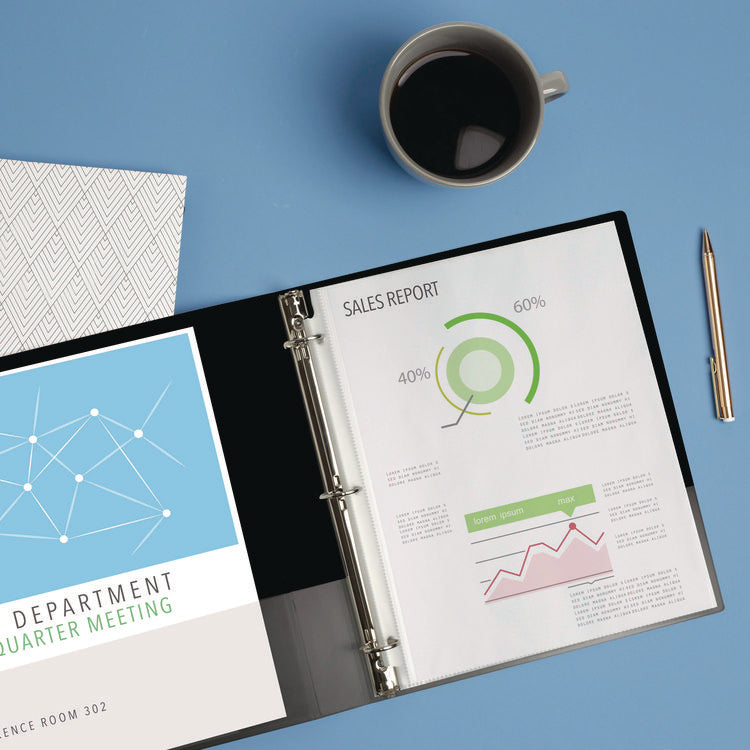 Simple is the smart way to go. For convenient organization of your documents, it doesn't get much simpler than this handy Economy Binder. Three round rings hold papers to let you flip through notes, reports and more without getting your pages out of order. With room to spare, class notes, employee handbooks and other important papers will find a perfect home. Slip loose pages into the two interior pockets for easy access later. Rings are mounted on back cover for a clean spine and pages lie flat.