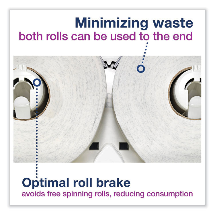 The Tork® Elevation® Bath Tissue Mini-Jumbo Roll Twin Dispenser is ideal for high-traffic washrooms where the guest experience is as important as high efficiency and low running cost. It ensures that tissue is always available by holding two full high-capacity rolls. Tork Elevation dispensers have a functional, modern design, that makes a lasting impression on your guests.