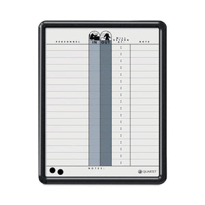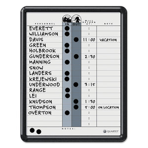 Maintain better organization with an in/out board to track employee status. Comprehensive personnel board tracks in/out status and notes for up to 18 employees on an ultra-durable, ultra-smooth DuraMax® porcelain surface that will not scratch, dent, stain or ghost. Delivers superior performance when communication is needed in high-profile, heavy-use office environments. Steel-backed porcelain creates a magnetic surface for posting documents. Effectively display information on easy-to-read grid lines with alternating gray shading. Easy-to-clean writing surface requires minimal use of Quartet® cleaning solutions. Easily secure board to wall with included mounting system. Contemporary black plastic frame complements any office's décor. Includes accessory magnets and marker.