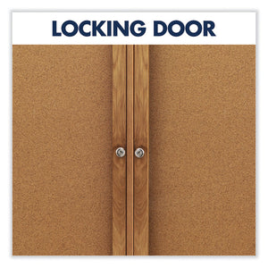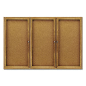 Enclosed Indoor Cork Bulletin Board with Three Hinged Doors, 72" x 48", Tan Surface, Oak Finished Fiberboard (MDF) Frame