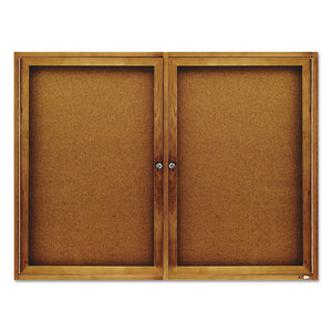 Enclosed Indoor Cork Bulletin Board with Two Hinged Doors, 48" x 36", Tan Surface, Oak Finished Fiberboard (MDF) Frame