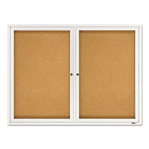 Enclosed Indoor Cork Bulletin Board with Two Hinged Doors, 48" x 36", Tan Surface, Satin Aluminum Frame