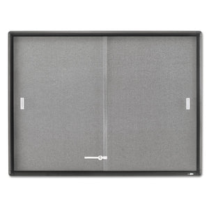 Enclosed Indoor Cork/Fabric Bulletin Board with 2 Sliding Glass Doors, 48" x 36", Gray Surface, Graphite Gray Aluminum Frame