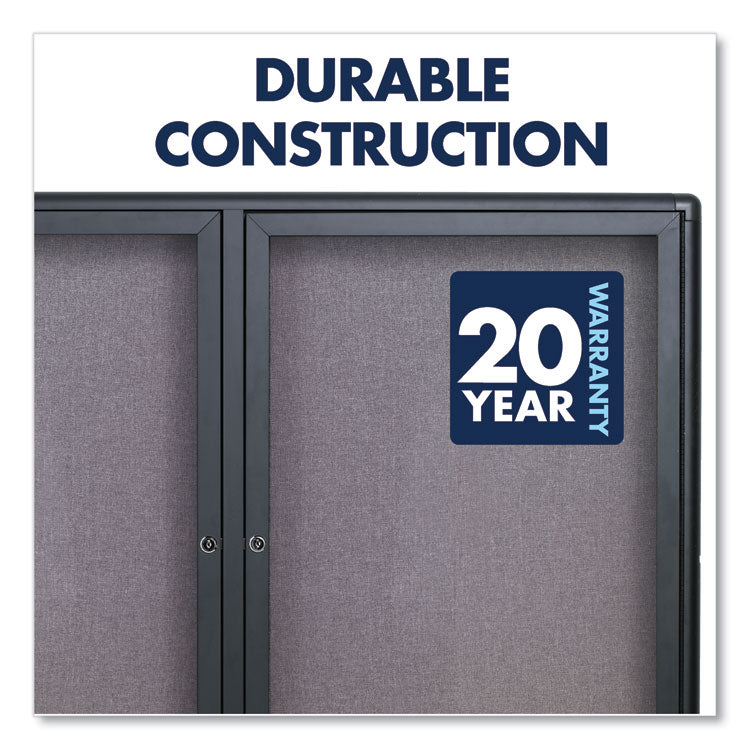 Highly durable, enclosed fabric bulletin board backed by high-density fiberboard secures documents with push pins. Locking shatterproof acrylic doors allow for posting, protecting and easily updating important messages. Delivers quality performance when communication is needed in employee lounges and other high-traffic areas. Self-healing surface eliminates unsightly pin holes and will not fade or crumble like traditional cork boards, even after years of use. High-density backing for maximum pin-holding power, ensuring documents stay securely posted. Easily mount board to wall with specially designed security lock system. Durable aluminum cabinet with rounded corners, full-length hinges and contemporary finished frame draw all eyes to important displays. Includes one key per lock. Available in other sizes and door options.