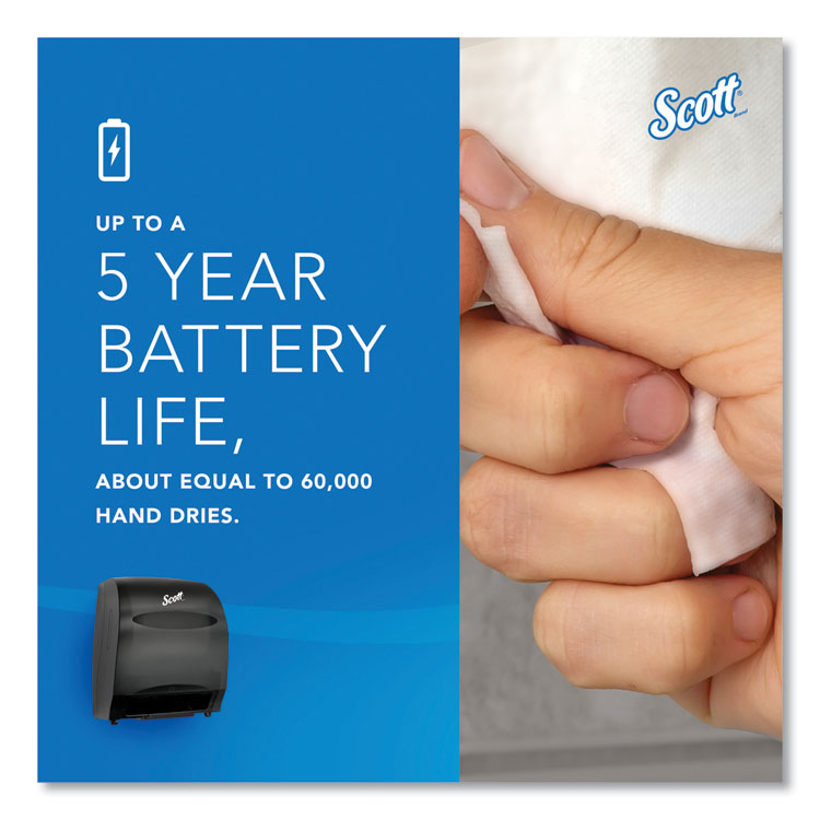 Scott Essential provides reliable balance of efficiency, performance and value. You have more important things to worry about than paper towels, so you can trust the Scott Essential Towel Dispenser System. A simple solution to keep you moving in a hectic, fast-paced world. The electronic paper towel dispenser offers up to five-year battery life: more than 120,000 dispenses on one set of batteries, equal to 60,000 hand dries. Dispenses one 8" diameter x 8", 950 foot hard roll of towels. It is 99.9% jam-free to ensure that you never miss a hand drying occasion, minimizing risk of cross contamination. The cover is durable, shatter-proof and transparent cover, so you can check supply levels without opening the dispenser.