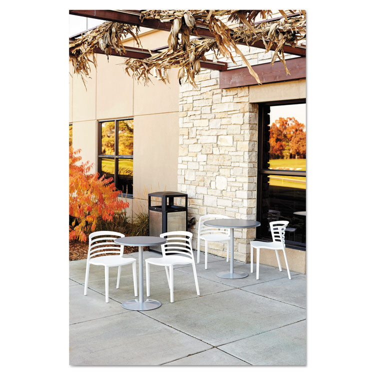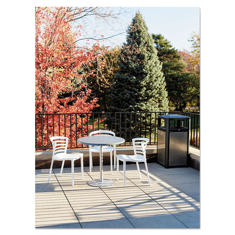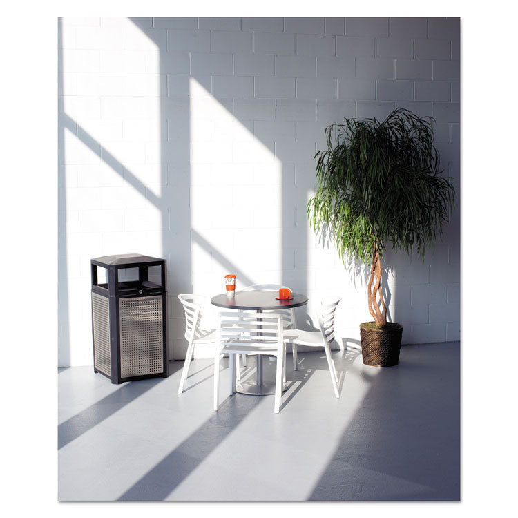 Safco Evos Outdoor/Indoor Steel Trash Can features four stylish perforated panels on a commercial-grade steel frame with galvanized base to resist rust and corrosion while keeping high traffic areas clean and litter free. The waste container includes a chip and peel-resistant rigid plastic liner for easy maintenance. Covered dome features four openings that let you discard waste without touching the lid, which may help reduce the spread of germs. Ideal for use on outdoor patios, meeting spaces, cafés, recreational and picnic areas, corporate and college campuses, boardwalks, tourist attractions, and other high traffic indoor and outdoor locations.
