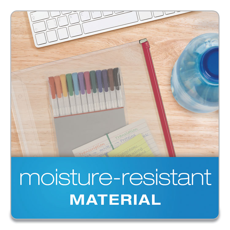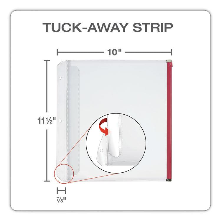 Cardinal® Poly Zippered Binder Pockets store and protect critical documents. These side-loading three-hole-punched inserts expand 1/2" to hold up to 100 sheets. Colorful slide zippers keep it all contained. Clear poly is non-stick and archival safe for documents and photos. Keeps critical papers—from passports to term papers—safe from accidents and spills. With zippers in blue, black, red, purple and green for color-coded organization.