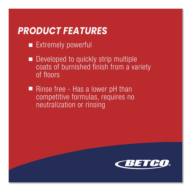 This high-power, high-speed floor stripper was developed to penetrate and remove multiple coats of burnished floor finish with a minimum amount of labor. Utilizing the latest in technology, this powerful professional stripper unlocks the chemical bonds of acrylic- and urethane-fortified floor finishes releasing them from the floor surface and is suitable for use on most surfaces. Recommended for removing multiple coats of water-based acrylic and urethane-fortified floor finishes from all types of resilient tile and hard surfaces. Not recommended for use on linoleum or sheet vinyl floors. Rinse-free formula has a lower pH than competitive formulas and requires no neutralization or rinsing.
