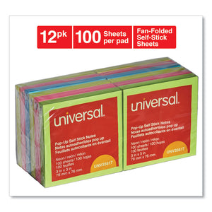 Fan-Folded Self-Stick Pop-Up Note Pads, 3" x 3", Assorted Neon Colors, 100 Sheets/Pad, 12 Pads/Pack