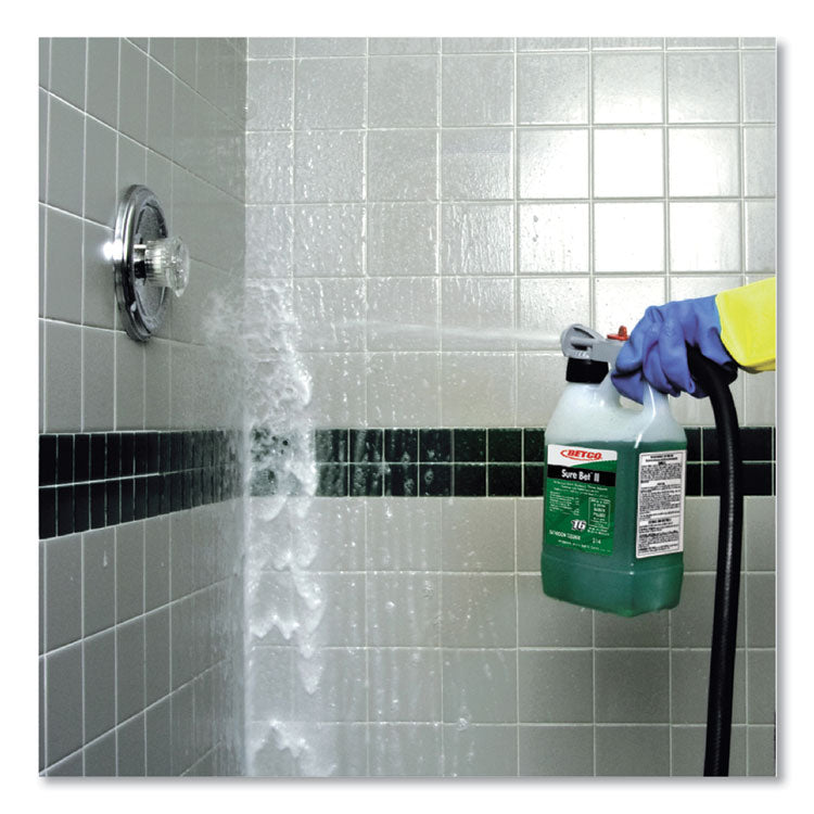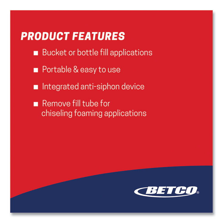 One portable dispensing system does it all. Fill bottles, buckets, automatic scrubbers and foaming spray applications from small convenient package. Simply hook up the hose and dial your application. Designed to fill a bucket or bottle. An integrated anti-siphon device saves money. Remove fill tube for chiseling foaming applications.