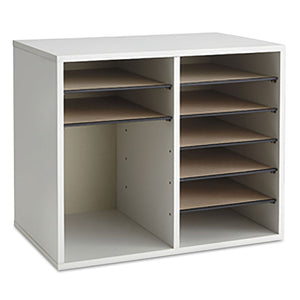 Ideal for desktop literature organization. Shelves are adjustable or removable to customize compartments for document, binder and office supply storage. Ten hardboard shelves form up to twelve 9w x 11 1/2d x 2 3/8h letter-size compartments and support up to 15 lbs. each. Made of 1/2" compressed wood with laminate finish; solid fiberboard back.