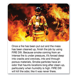 Because smoke coming from an intense fire is under pressure, it is forced deep into cracks and crevices, into and through porous materials. Smoke particles have an odor that haunts building owners long after clean-up, particularly when humidity is high. FIRE D will finish the job by removing the odor. Use FIRE D ONE SHOT AEROSOL FOGGER to kill after-fire odors in automobiles and other small enclosed areas where a fogging machine would be awkward or electrical power is not available. Use one can for every 10,000 cubic feet of space.