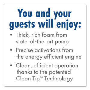 Dial® FIT® dispenser features the smallest footprint and cubic area in its class with subtle curves that complement the aesthetics of any washroom. Enjoy Thick, rich foam from our state-of-the-art pump. High-efficiency engine provides an industry leading >90,000+ precise activations. Clear side panel strip for fill-level visibility without opening. 4D Duracell Alkaline batteries included. 1, 2 or 3 shots per activation. Smart-Sensor Technology discontinues activation if hand is removed. Clean Tip™ Technology cleans the pump tip after each use to minimize drip risk.