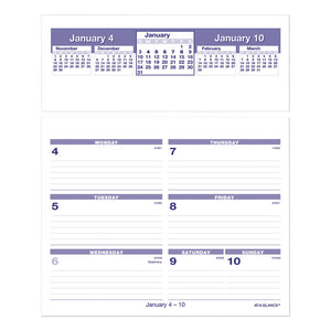 Weekly pages flip up and drop into convenient storage base. One week per page, ruled for open scheduling. Current, two past and two future months reference; federal holidays highlighted. Printed in blue and red inks.