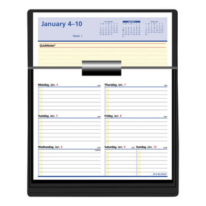 Yellow highlighted section for notes and to-do's. Weekly pages flip up and drop into convenient storage base. One week per page, ruled for open scheduling. Past, current and future months reference; federal holidays highlighted. Printed in blue, yellow and red inks. (Base not included.)