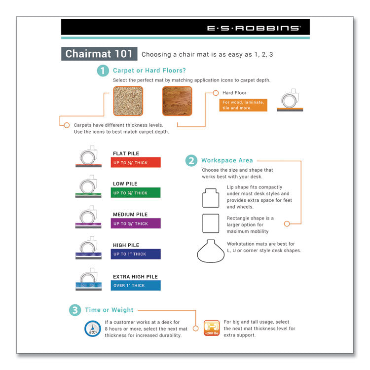 ES Robbins® Floor+Mate® All-Purpose chair mats are ideal for hard floor surfaces and medium pile carpet (up to 0.75" including padding). Enjoy a smooth rolling surface that enhances your ergonomic comfort while protecting your floors from scuffs, scrapes and chair caster wear. Floor+Mate® chair mats have a vinyl grip backing and no sharp spikes!