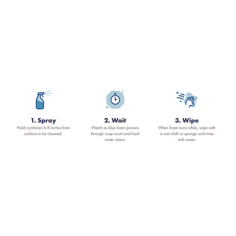 Takes the guesswork out of cleaning. Spray on the penetrating blue foam and OxiClean Stain Fighters go to work on contact, breaking up soap scum and hard water stains. When the foam turns white, just wipe and rinse to reveal a brilliant shine. Cleans with a fresh scent and no obnoxious fumes. Also removes dirt, calcium, lime, grease and grime. Great for use on tubs, glazed ceramic tile, fiberglass, shower doors, vinyl curtains, sinks, countertops and chrome fixtures.