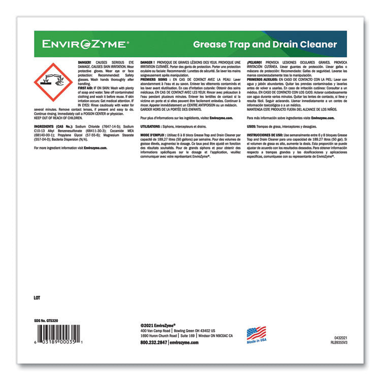 Grease Trap and Drain Cleaner is a specifically formulated bacteria block. It is packaged for use in restaurant drains and grease traps. Simple and easy to use, it dissolves and releases beneficial bacteria to digest FOG and maintain clean, free-flowing systems. It is formulated with targeted surfactants that loosen food particles and grease deposits so that the bacteria can quickly begin digesting organic wastes. Regular use reduces the frequency of manual cleanouts, prevents blockages, and lowers grease disposal costs.