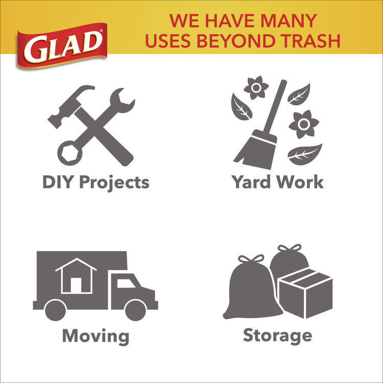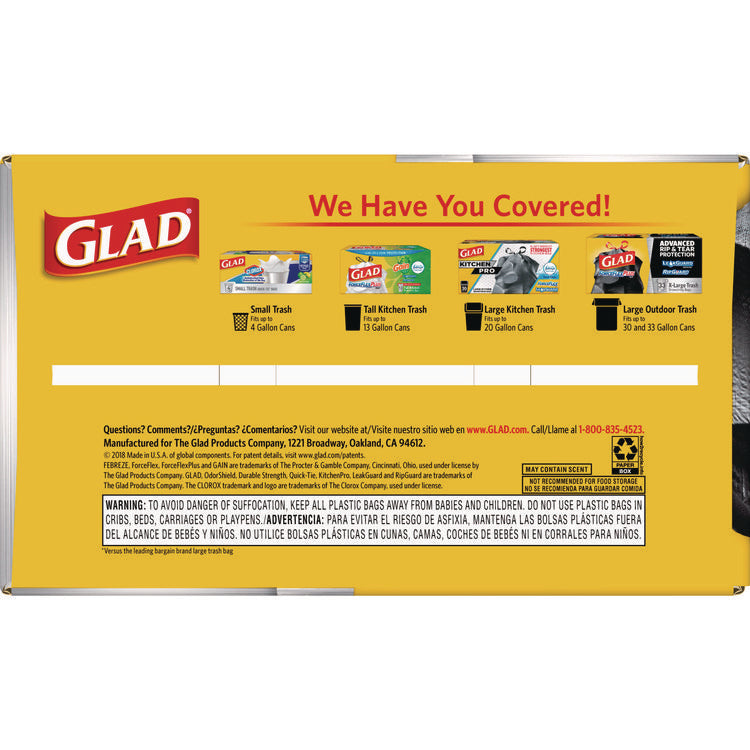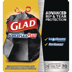 Glad® ForceFlexPlus™ Drawstring Bags are designed with Durable Strength™ and a reinforced side seam to let you carry the heaviest loads without tearing the bag. The large capacity bags fit a 30 gallon can and stretch around your trash with the ForceFlexPlus™ technology to prevent rips and tears. Built with advanced rip and tear protection, the LeakGuard™ Protection and RipGuard™ Protection can withstand even the toughest and messiest trash, so that what goes in, stays in. The strong reinforcing drawstring closure grips the can and ensures easy closing and lifting with one quick pull. These garbage bags are perfect for tough jobs throughout your home or office, indoor or outdoor. Ideal for use in restaurants, offices and other commercial facilities. Take out the trash with Glad® reliability and guaranteed stretchable strength.