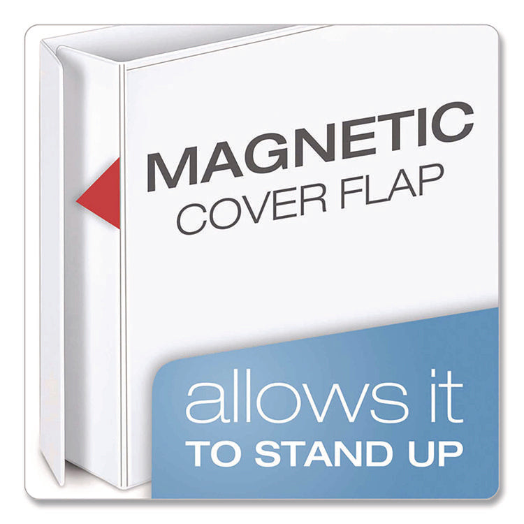Magnetic flap closure stabilizes binder, allowing it to stand and stack unaided. Five color ID rings (provided with each binder) snap in and out for easy identification. Clear overlay for customization on all three sides with one letter-sized sheet. ONE-TOUCH® Easy Open® rings open, close and lock with one simple motion. Non-stick, PVC-free cover with clear overlay for customization of front, back and spine.