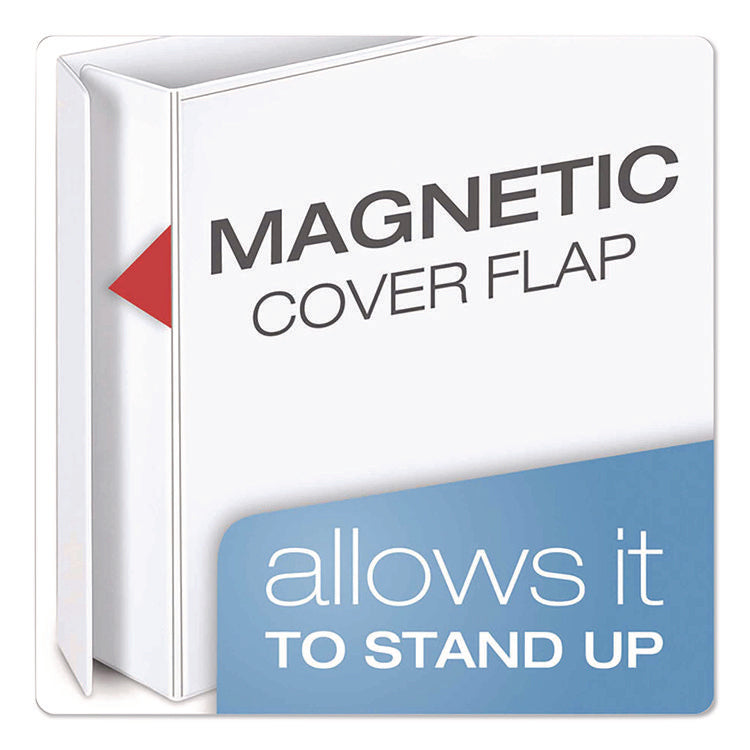 Magnetic flap closure stabilizes binder, allowing it to stand and stack unaided. Five color ID rings (provided with each binder) snap in and out for easy identification. Clear overlay for customization on all three sides with one letter-sized sheet. ONE-TOUCH® Easy Open® rings open, close and lock with one simple motion. Non-stick, PVC-free cover with clear overlay for customization of front, back and spine.