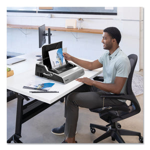 Fellowes® Galaxy Comb Binding Systems are designed for frequent use. This hard-working binding system is ideal for large-office applications. Unique removable binding mechanism can be used separately for increased productivity. Three releasable dies for different document sizes. Enhanced accuracy edge guide and vertical paper loading for pinpoint punch alignment. Built-in comb storage tray with integrated document measuring device. Front-access waste tray. Includes binding starter pack.