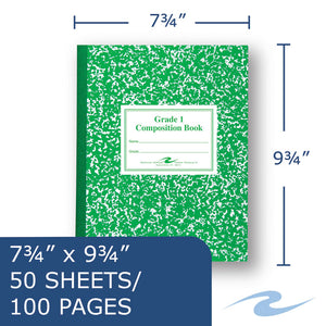Grade School Ruled Composition Book, Grade 1 Manuscript Format, Green Marble Cover, (50) 9.75 x 7.75 Sheets