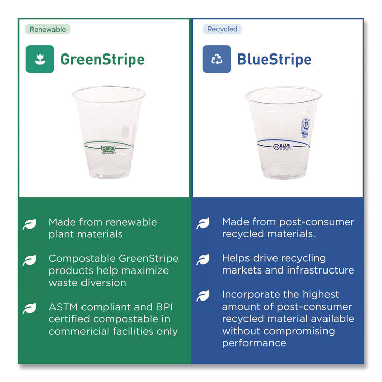GreenStripe cold cups are perfect option for water, juice, or other cold drinks. Showcase your commitment to sustainability with our classic GreenStripe cold cups. Made from PLA, a plant-based plastic, these cups are renewable and compostable. They're made from crops that grow back every year, and they can be composted commercially (where facilities exist) and returned to the soil to help new plants grow. Compatible flat- and dome-lid options (sold separately) allow you to use the same cup type for both cold and frozen drinks. They're BPI certified compostable and ASTM compliant.