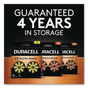Hear every moment with long-lasting power in Duracell Hearing Aid Batteries. Duracell Hearing Aid batteries are color-coded, making it easy to find the size that's right for you. Plus, they are guaranteed for four years in storage, so you can rest assured they will be ready when you need them. To help ensure the safety of children, they come in a child-secure packaging, which is nearly impossible to open without scissors. For all your hearing device needs, Duracell is the # 1 trusted battery brand.