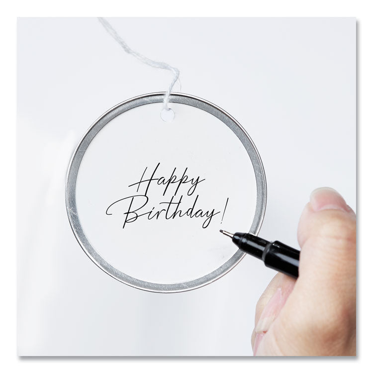 Get ready for a tag that stands up to pressure. These Metal Rim Tags are constructed of white stock with a rim of durable metal. The stock provides a smooth, clean surface for writing, while the non-tarnish metal rim reinforces the tag to keep it from bending, twisting or tearing, making the tags ideal for situations where they will be handled frequently or roughly. The knotted white string lets you easily attach the tag to your item. For strength and durability, this tag is the answer.