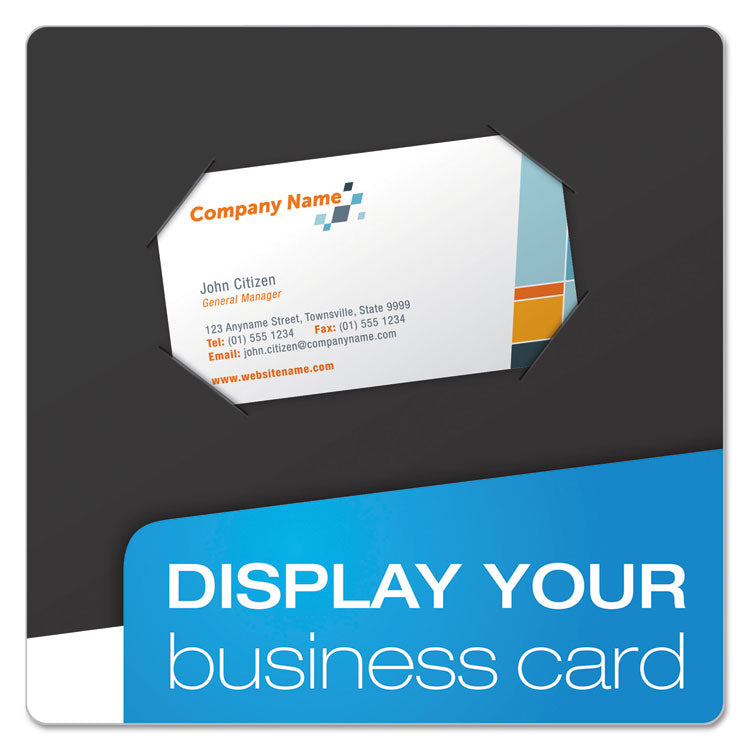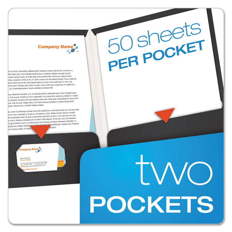 Bright, laminated high-gloss covers get attention. Die-cut business card holder on inside front cover keeps contact information at hand. For 11 x 8.5 sheets. Holds up to 100 sheets (50 per pocket).