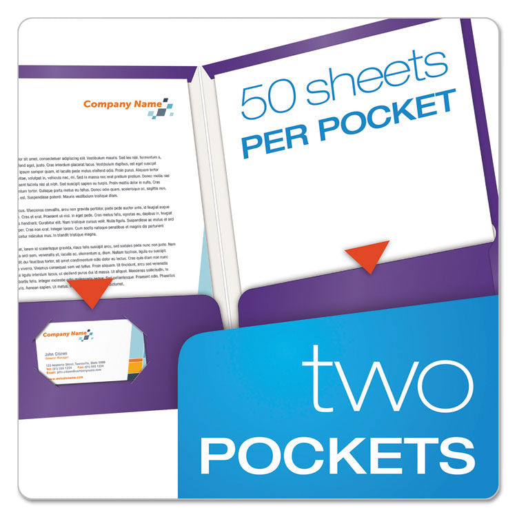 Bright, laminated high-gloss covers get attention. Die-cut business card holder on inside front cover keeps contact information at hand. For 11 x 8.5 sheets. Holds up to 100 sheets (50 per pocket).